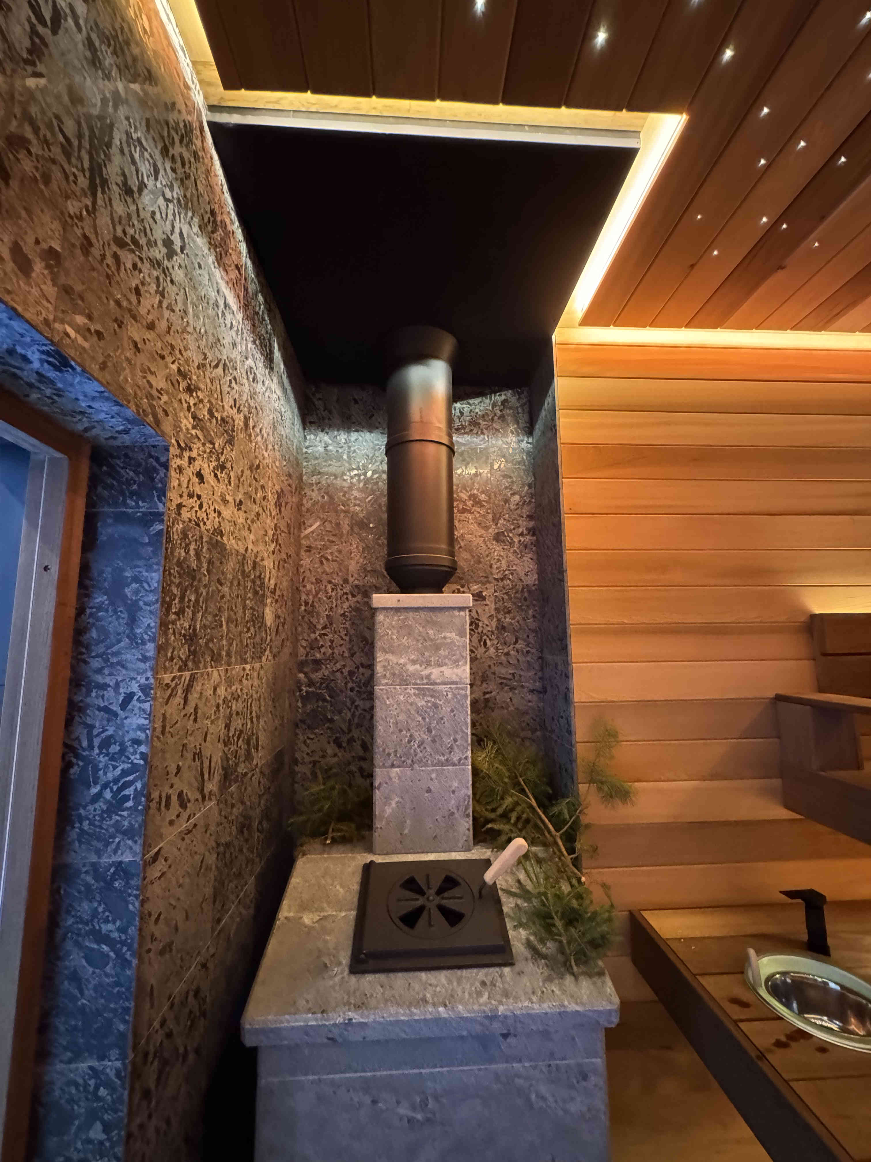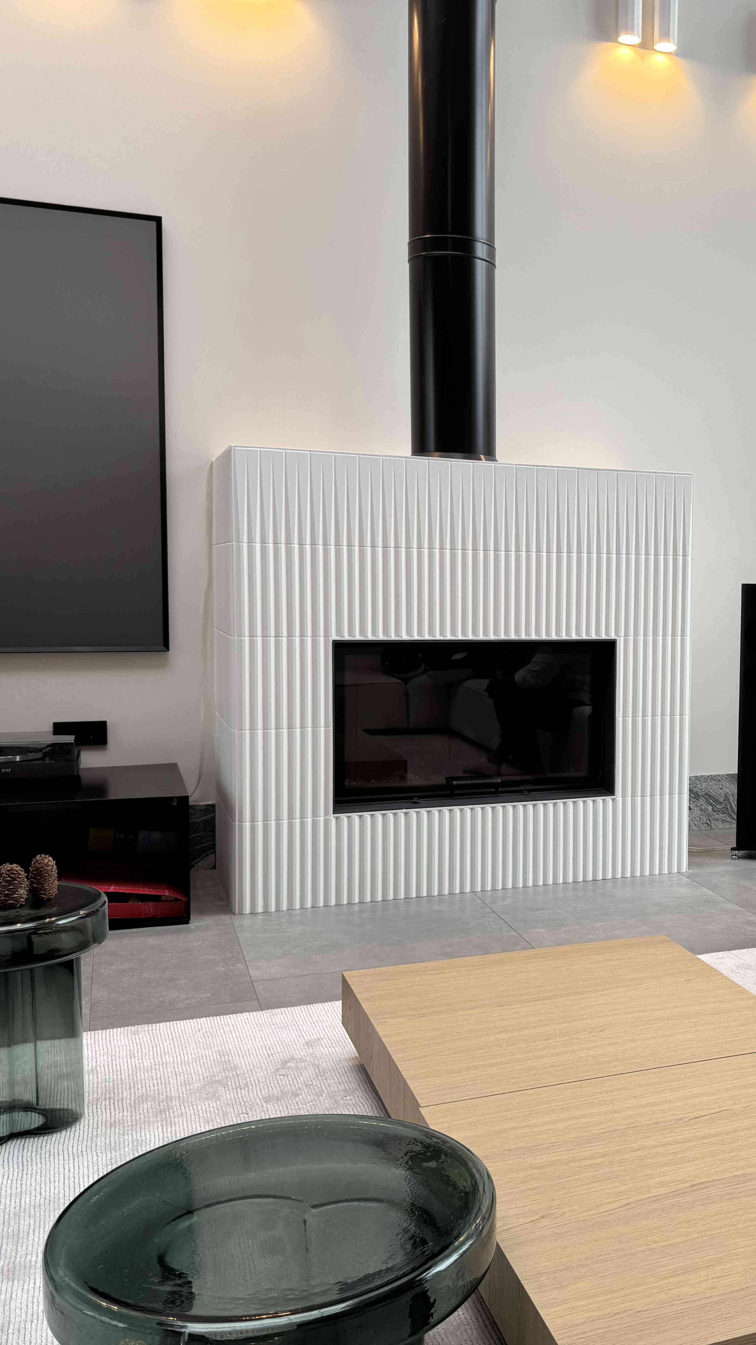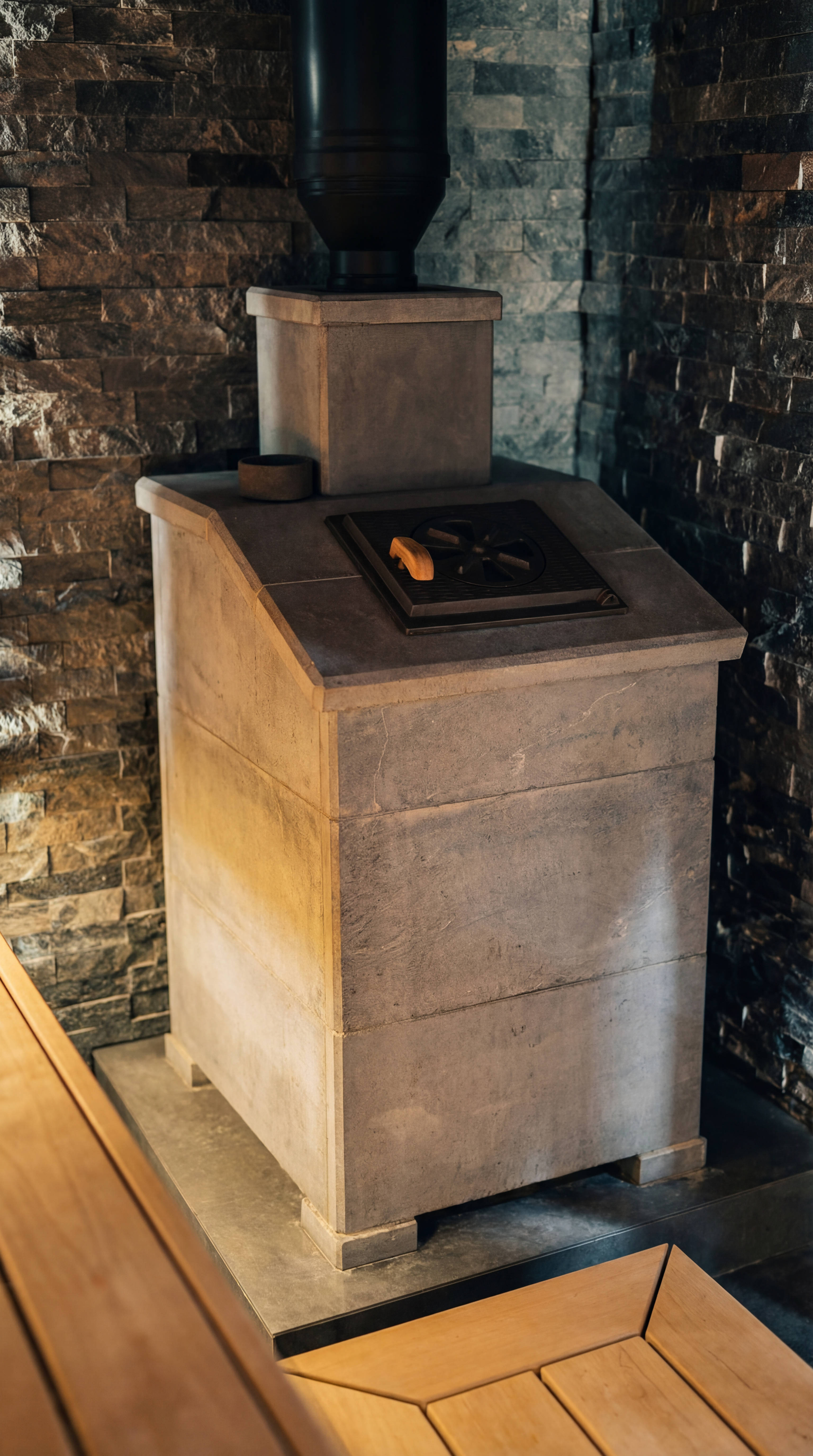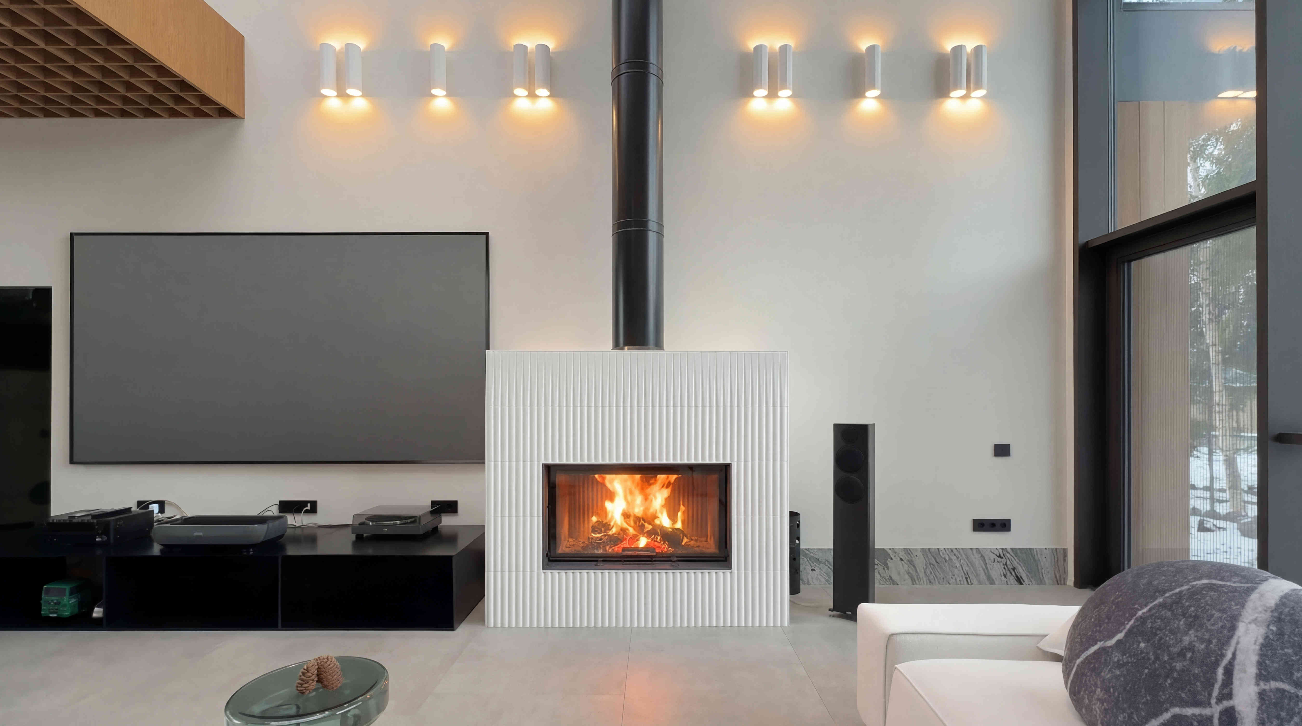 Фактурная кирпичная кладка создаёт выразительный контраст со светлыми стенами из деревянной вагонки и массивными потолочными балками. Открытые ниши для хранения дров интегрированы в основание комплекса, подчёркивая стилистику загородного шале и обеспечивая удобство использования.