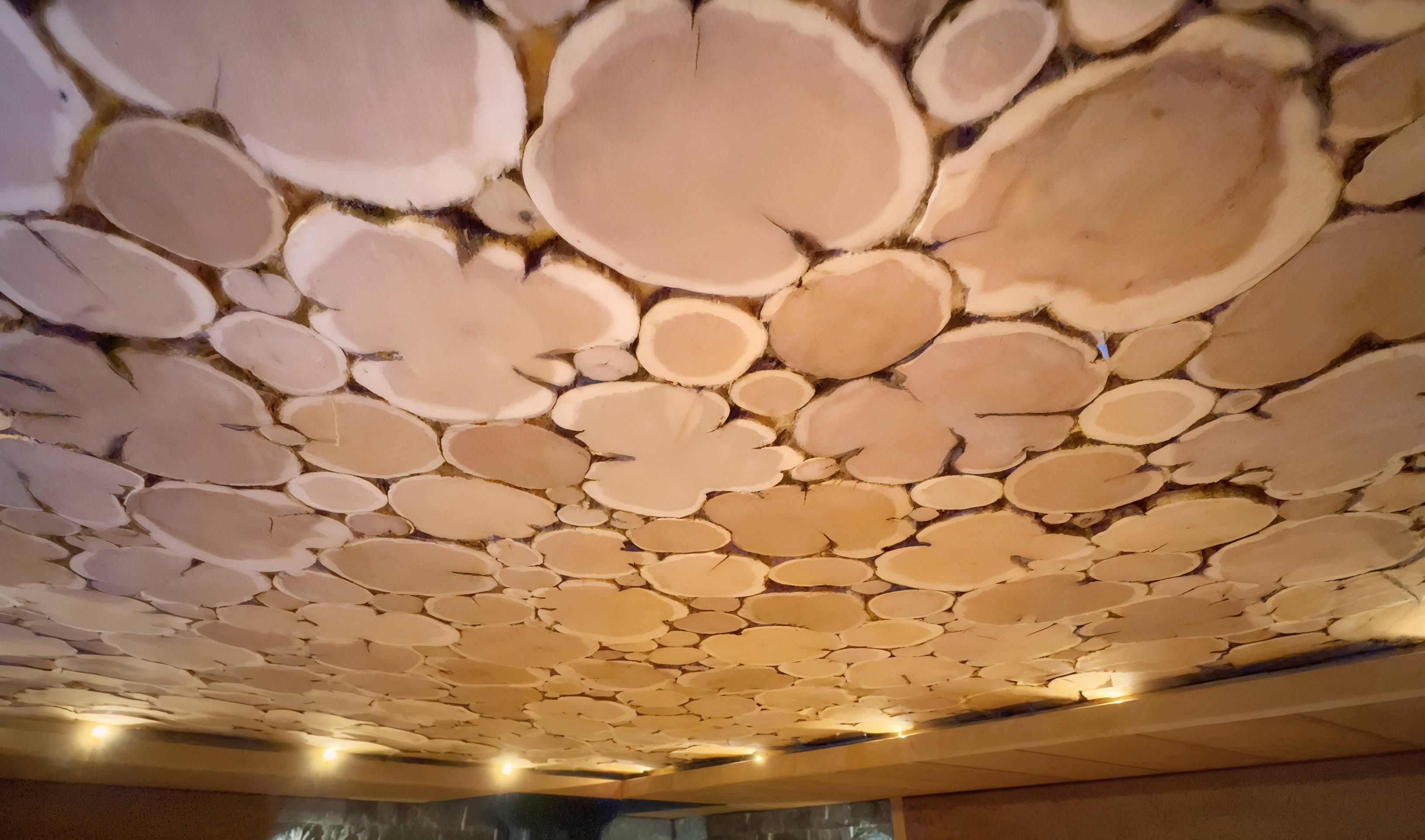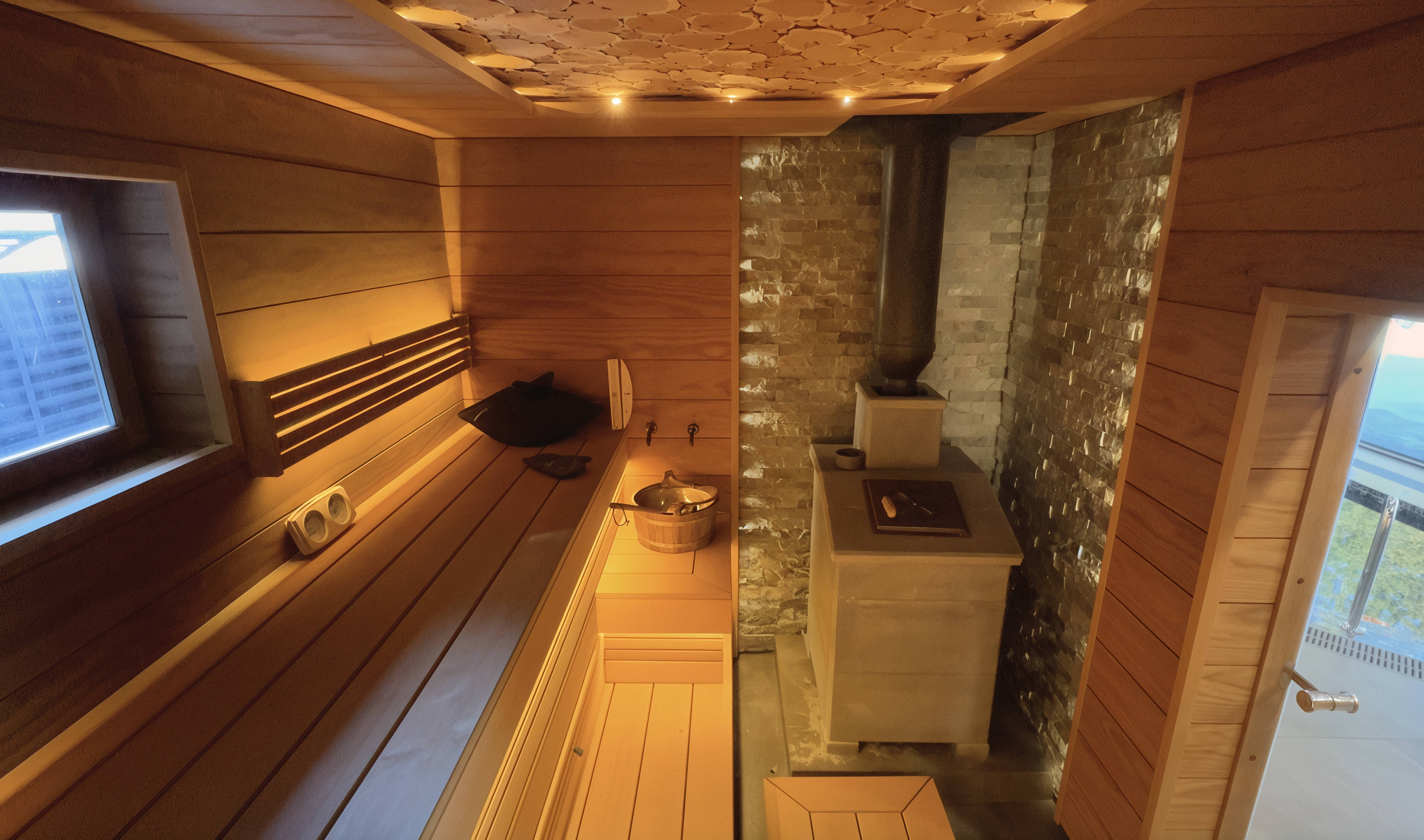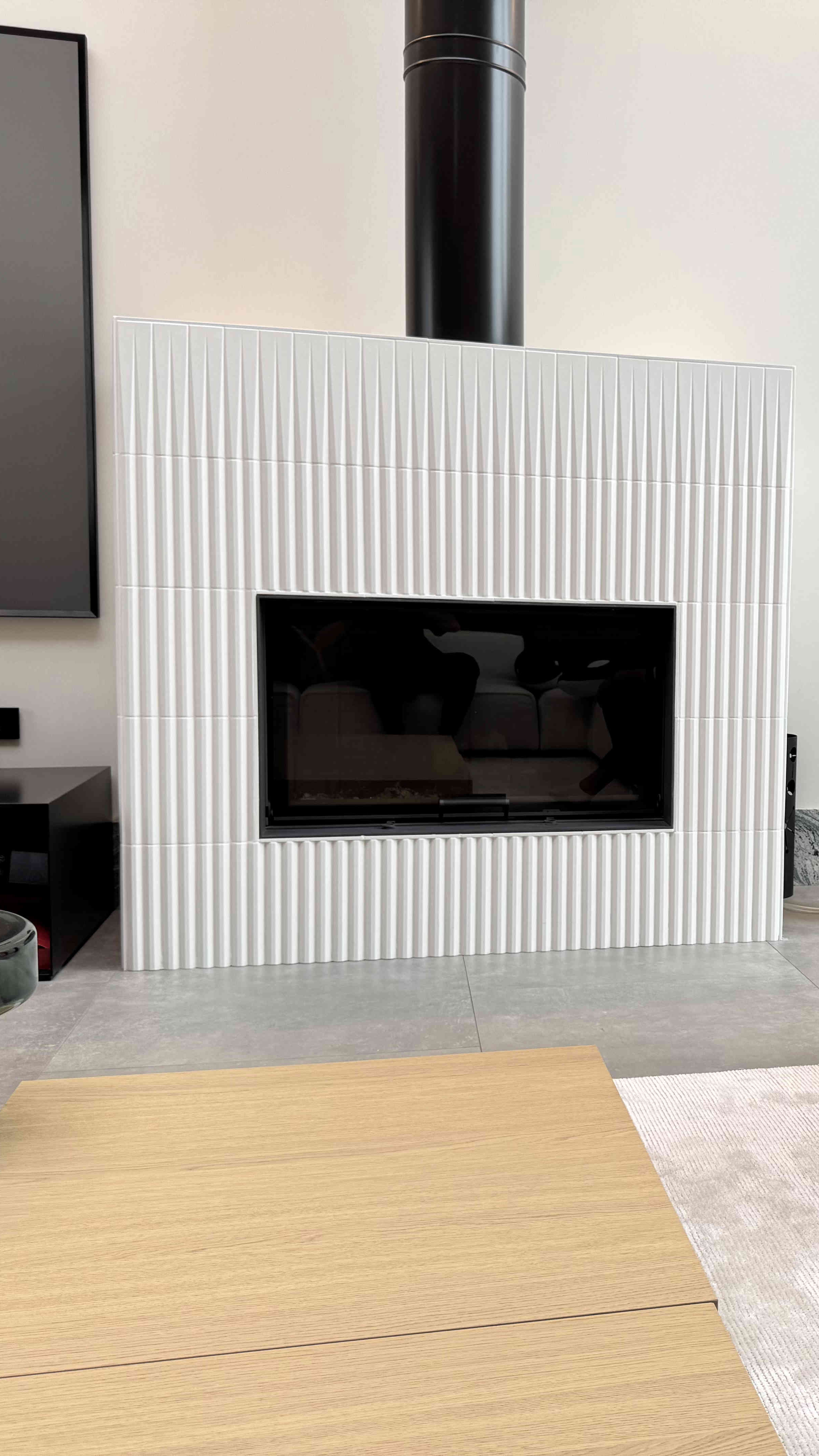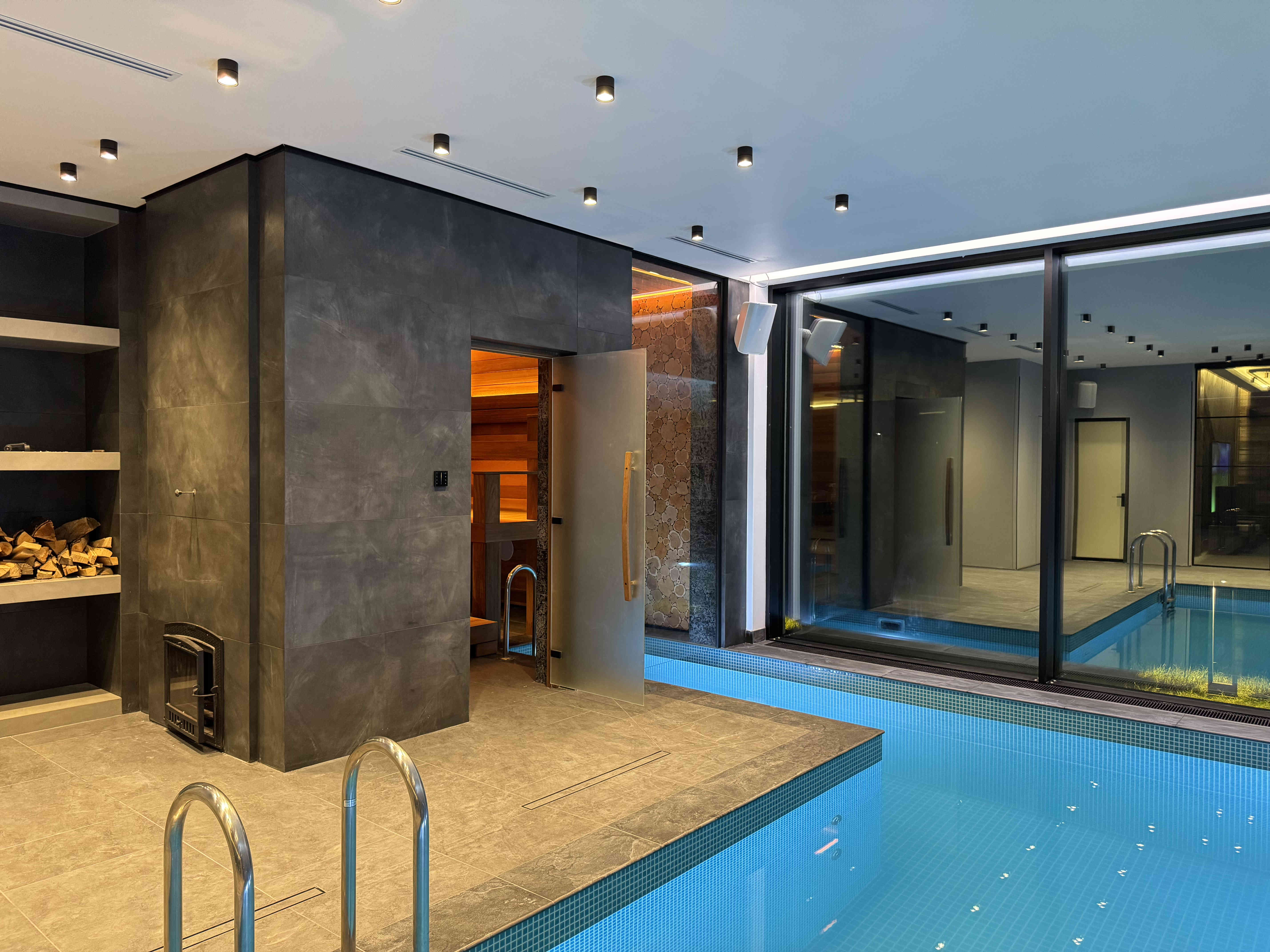 Фактурная кирпичная кладка создаёт выразительный контраст со светлыми стенами из деревянной вагонки и массивными потолочными балками. Открытые ниши для хранения дров интегрированы в основание комплекса, подчёркивая стилистику загородного шале и обеспечивая удобство использования.