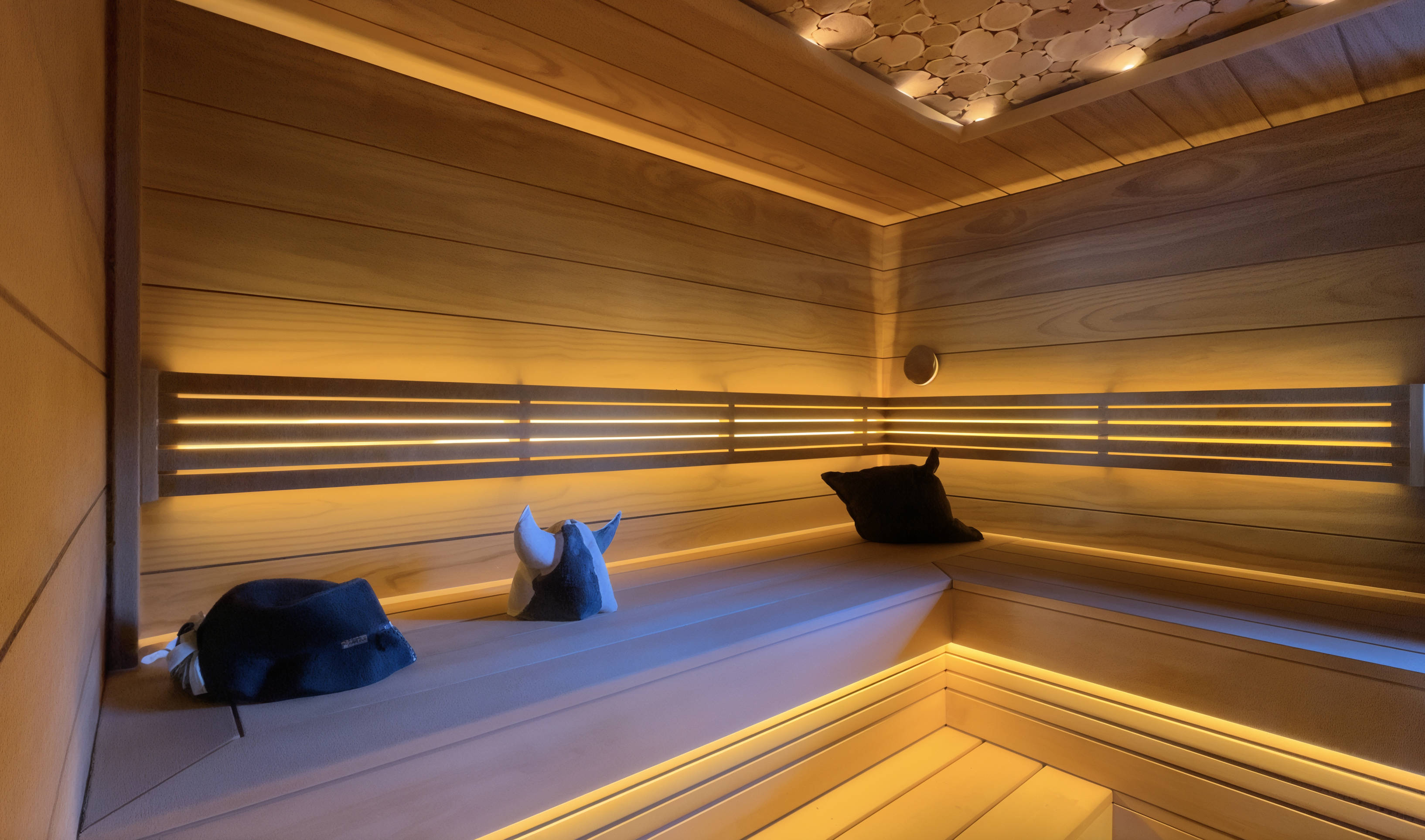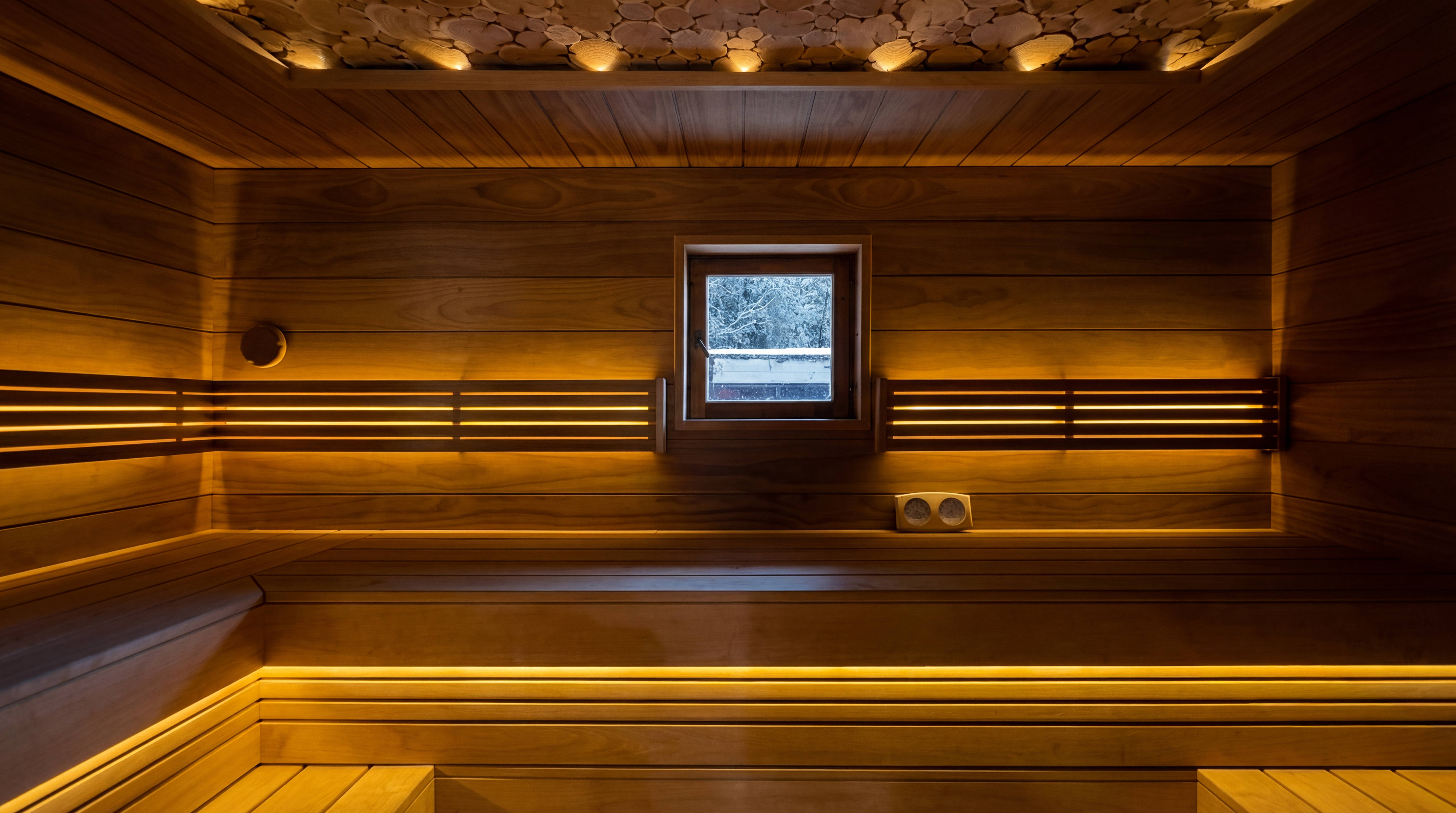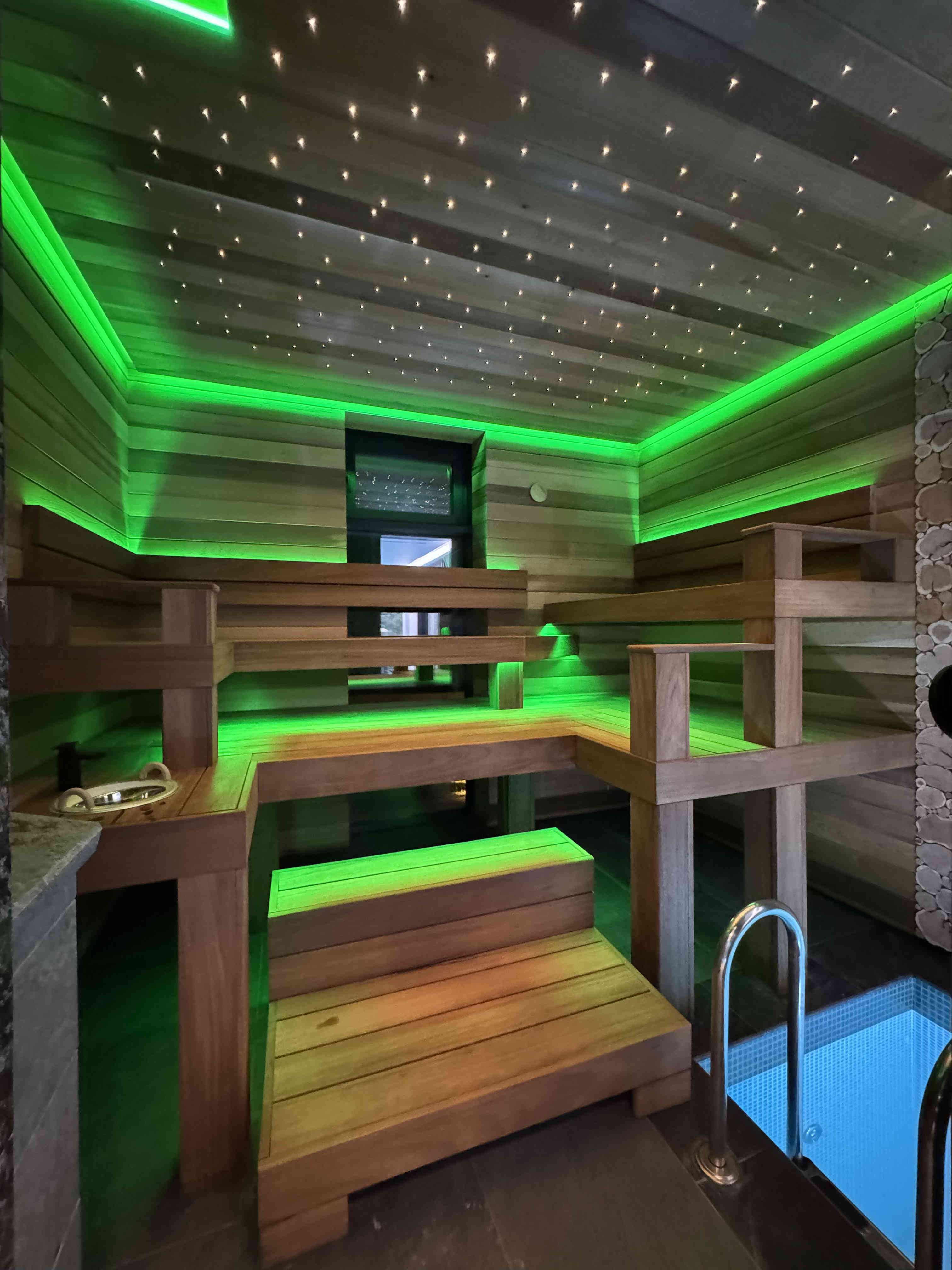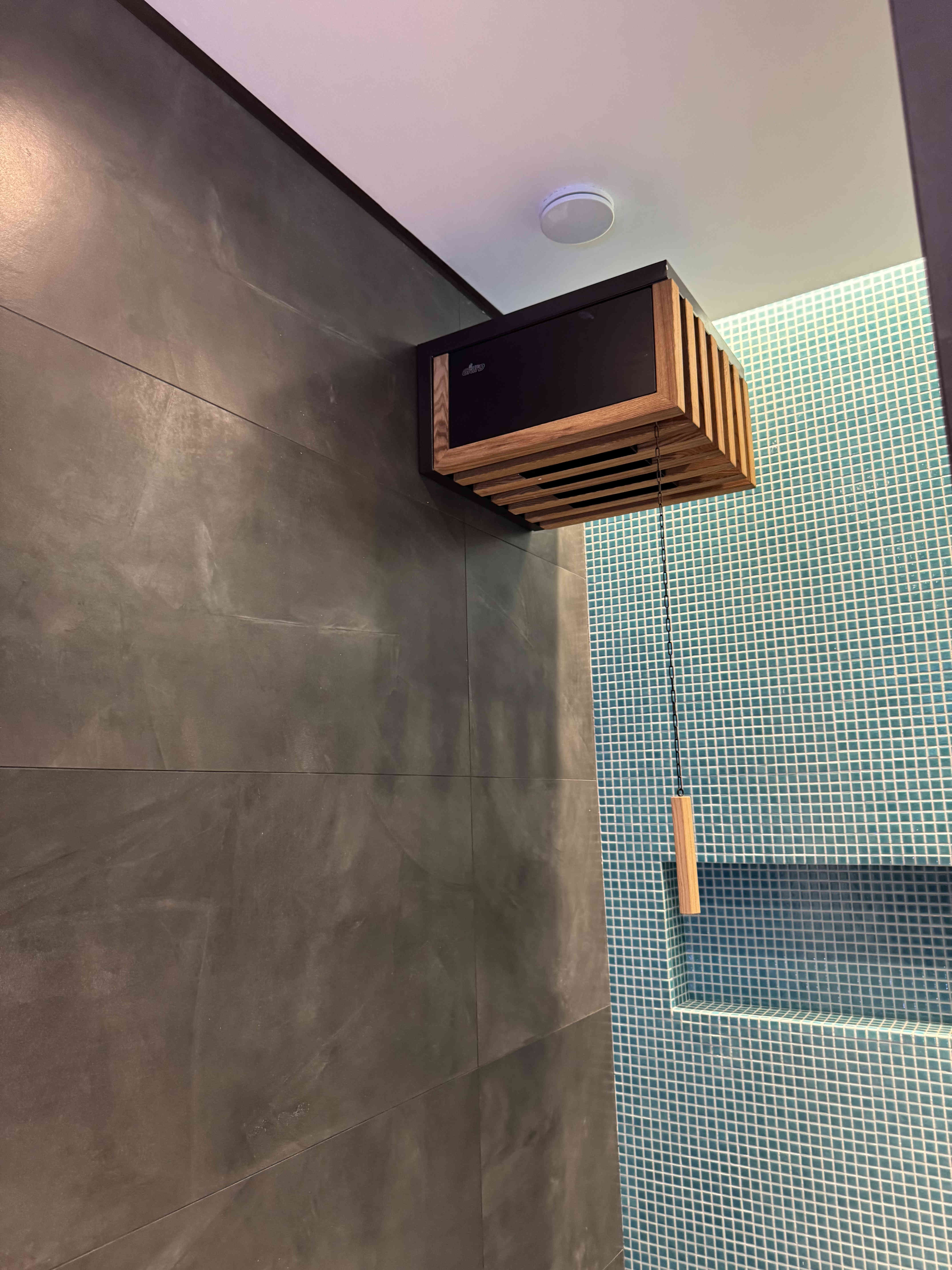Фактурная кирпичная кладка создаёт выразительный контраст со светлыми стенами из деревянной вагонки и массивными потолочными балками. Открытые ниши для хранения дров интегрированы в основание комплекса, подчёркивая стилистику загородного шале и обеспечивая удобство использования.