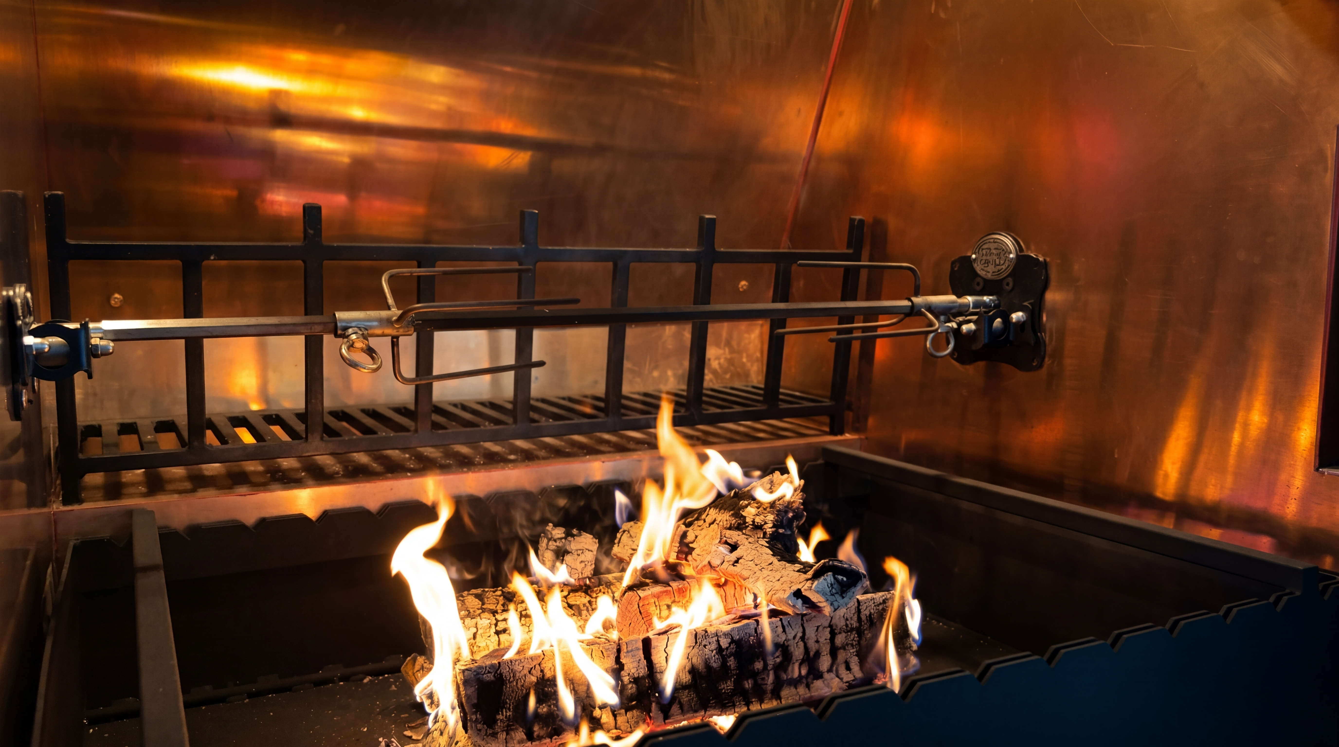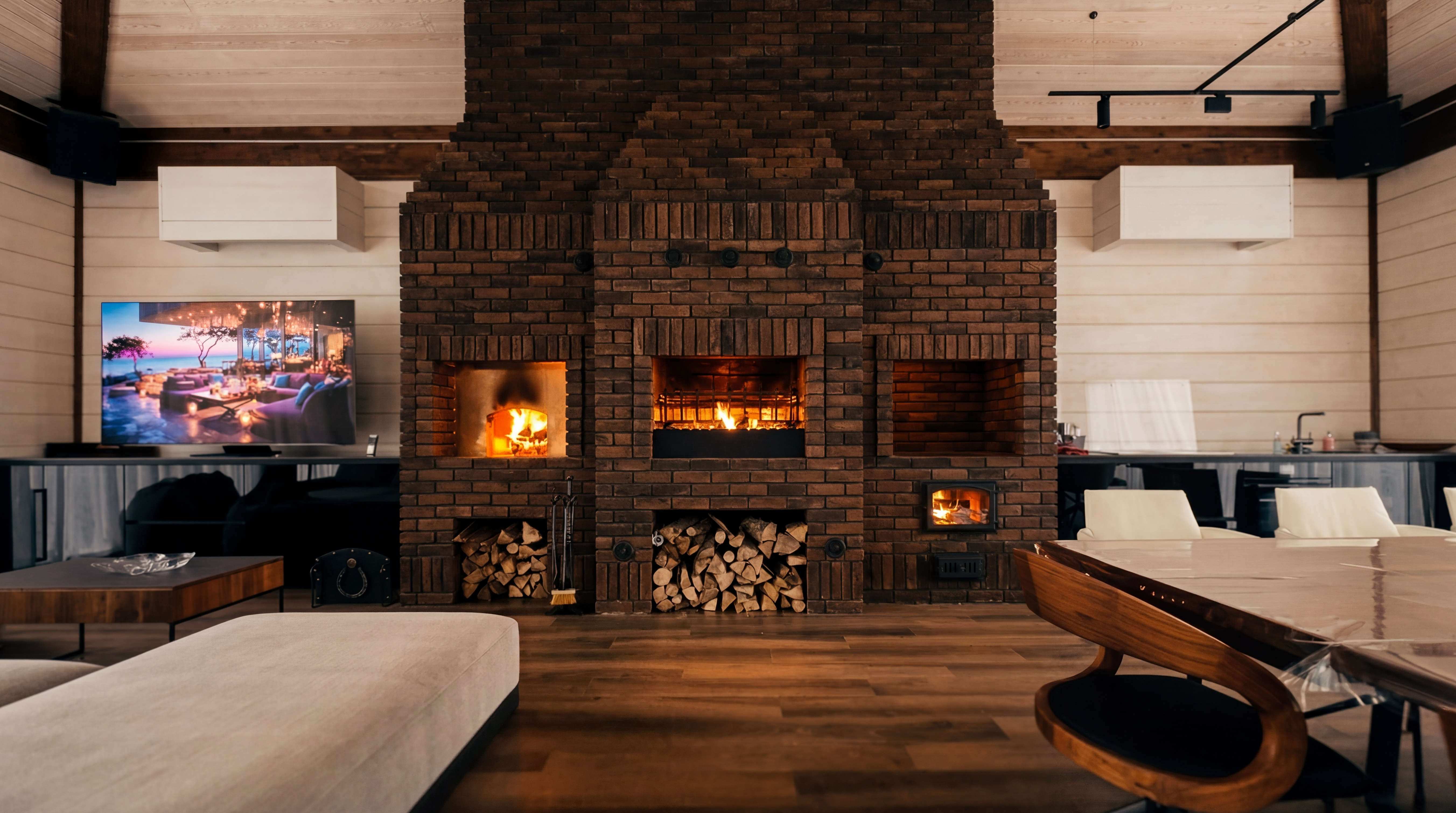 Массивный каминный комплекс из тёмного кирпича расположен в центре просторного деревянного дома с высокими потолками, визуально разделяя гостиную и столовую зоны. Архитектурная конструкция включает несколько очагов: центральный гриль-камин, боковой камин с топкой и нишу для приготовления пищи, создавая функциональный центр притяжения.