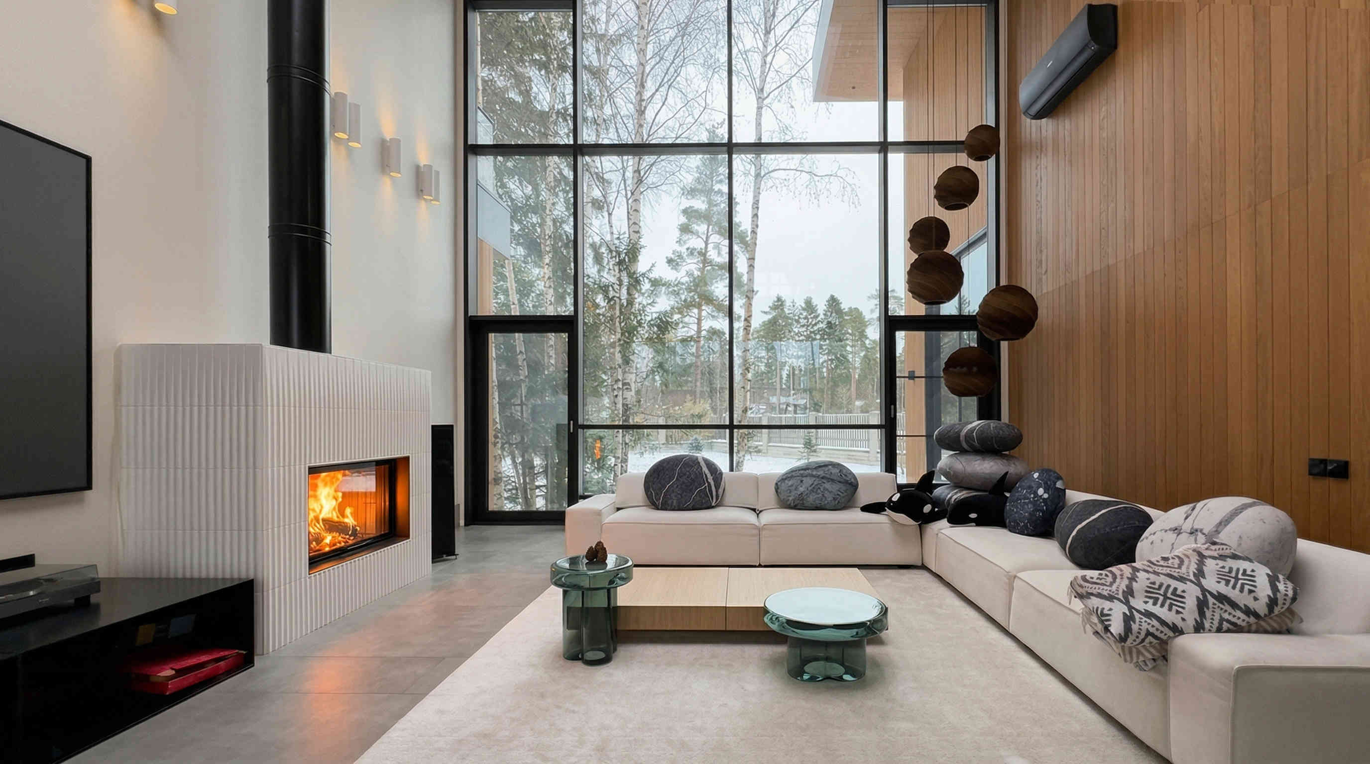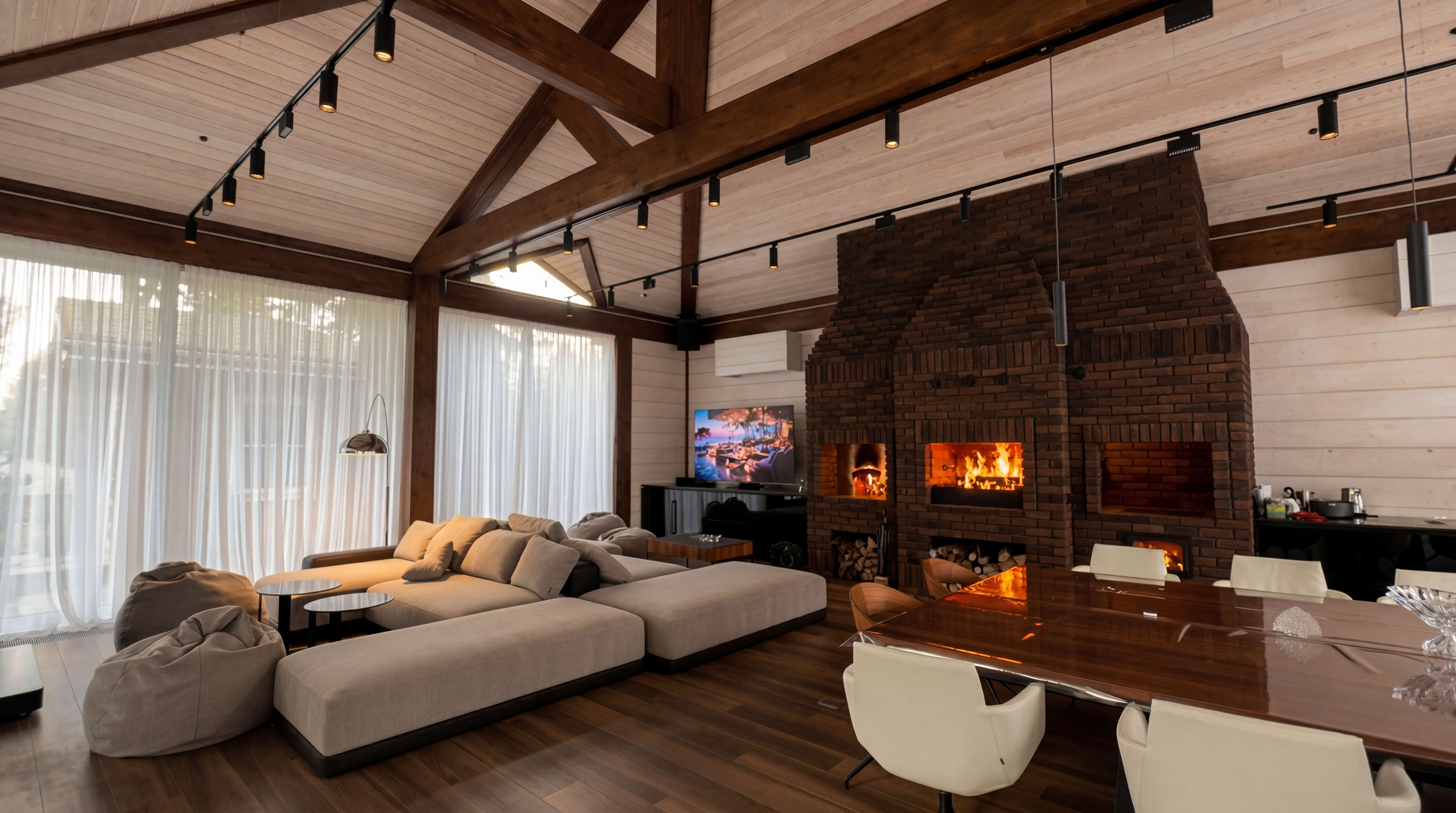 Такое решение идеально для больших семейных домов в стиле лофт или шале, где важны вместительность и атмосфера уюта. Зона отдыха с мягким диваном и обеденная группа с длинным столом объединены теплом живого огня, делая это пространство идеальным местом для шумных застолий и вечернего отдыха.