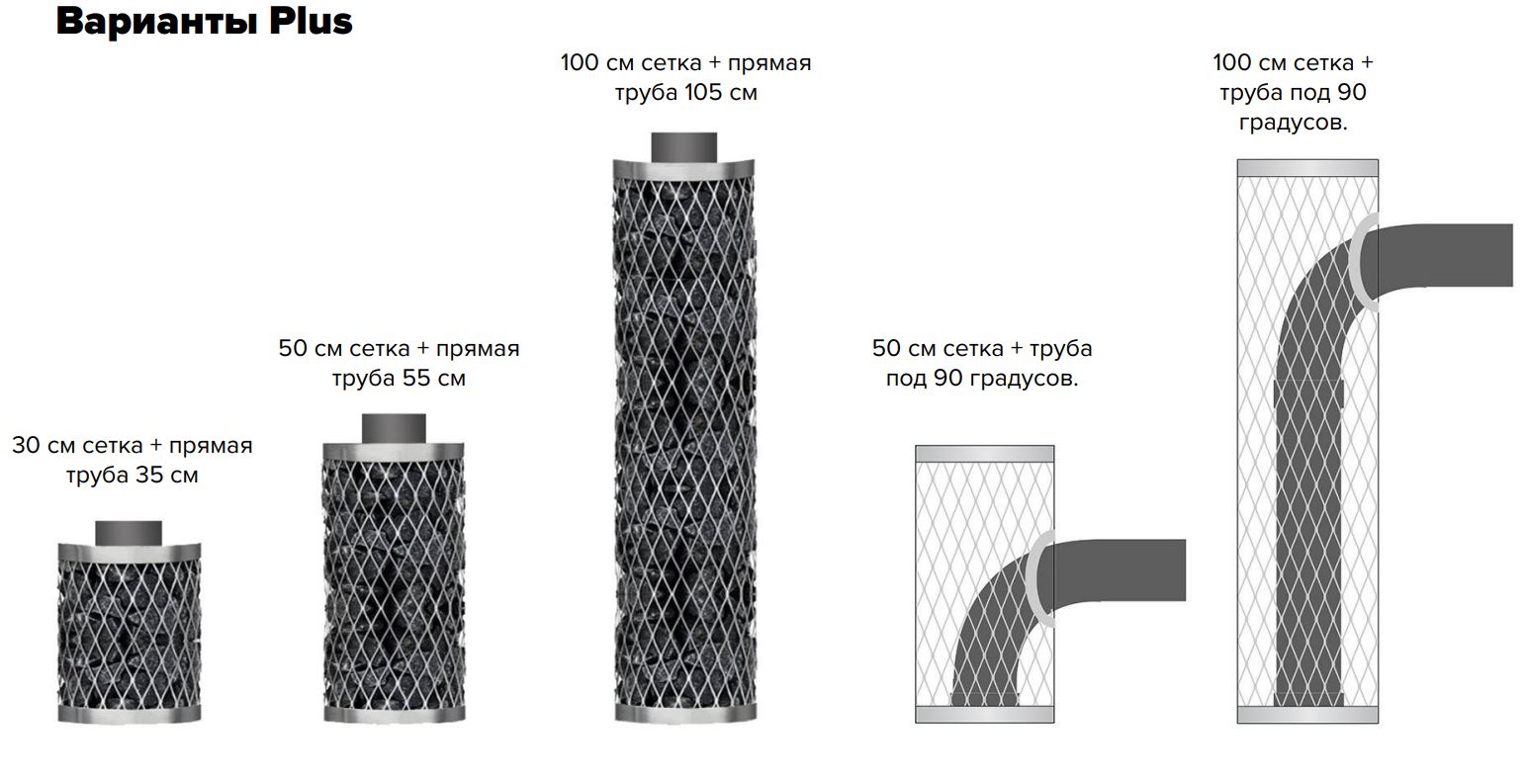 Комплект IKI Plus представляет собой готовое решение для организации дымохода и каменной засыпки в банных печах. В набор входит сетка для камней высотой 100 см и дымовая труба с углом поворота 90 градусов, что обеспечивает гибкость при монтаже.
