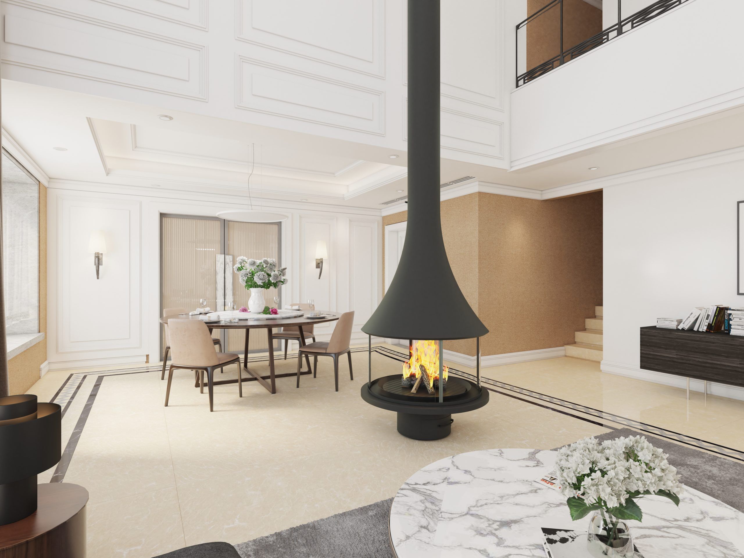 Центральный дровяной камин Bordelet Marina 993 представляет собой современное отопительное решение для просторных помещений. Модель выполнена в стиле хай-тек и отличается панорамным остеклением по всему периметру, что обеспечивает обзор огня с любой точки комнаты.