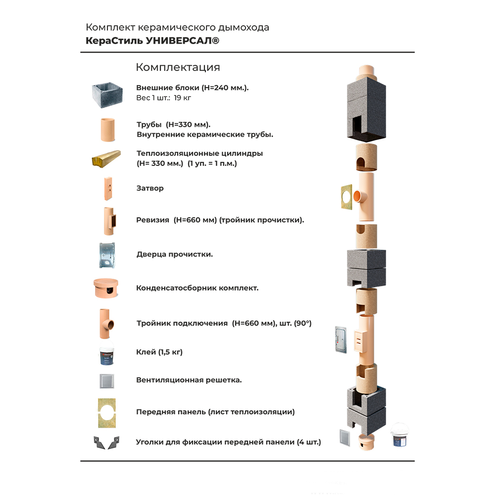 Керамический дымоход КераСтиль Универсал представляет собой современную трехслойную систему для эффективного отвода дымовых газов. Данная модель диаметром 180 мм и высотой 12 метров оснащена верхним комплектом тип 1 из нержавеющей стали, что обеспечивает надежную защиту от атмосферных воздействий.