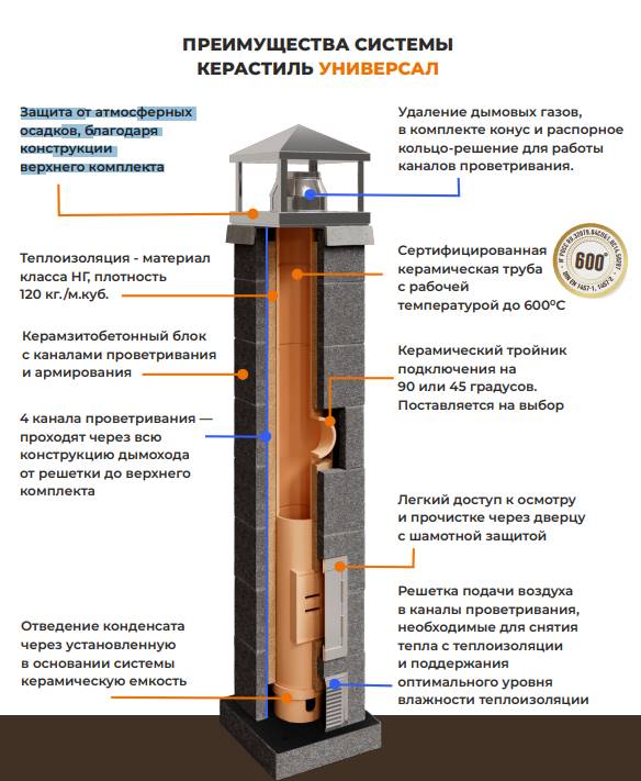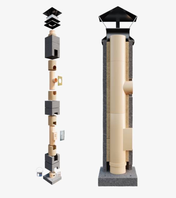 Керамический модульный дымоход КераСтиль Универсал диаметром 180 мм представляет собой современную трехслойную систему для эффективного отвода дымовых газов. Этот дымоход подходит для банных печей мощностью до 30 кВт или до 30 кубов парной, а также для отопительных печей и каминных топок с выходным патрубком до 180 мм диаметра.