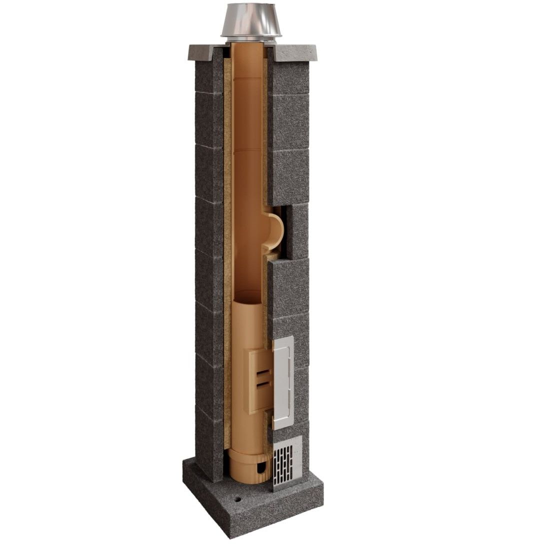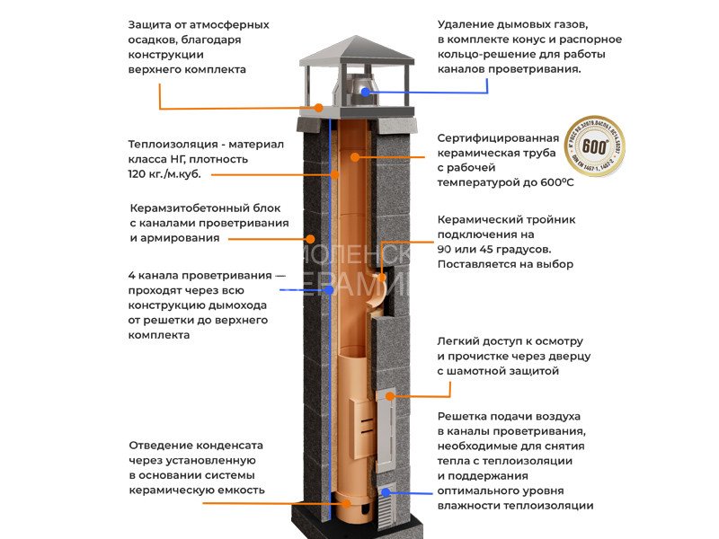 Керамический дымоход КераСтиль Универсал представляет собой готовую трехслойную систему для эффективного отвода дымовых газов. Данная модель диаметром 200 мм и высотой 12 метров оснащена верхним комплектом типа 1 из нержавеющей стали, что обеспечивает надежную защиту от атмосферных воздействий.