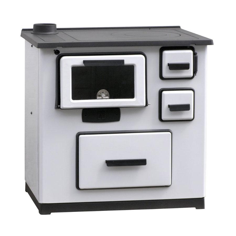 Отопительно-варочная печь Plamen SLAVONAC N белого цвета с боковым подключением трубы представляет собой многофункциональное решение для обогрева помещений и приготовления пищи. Эта чугунная печь-камин сочетает в себе классический дизайн и современные технологии отопления.