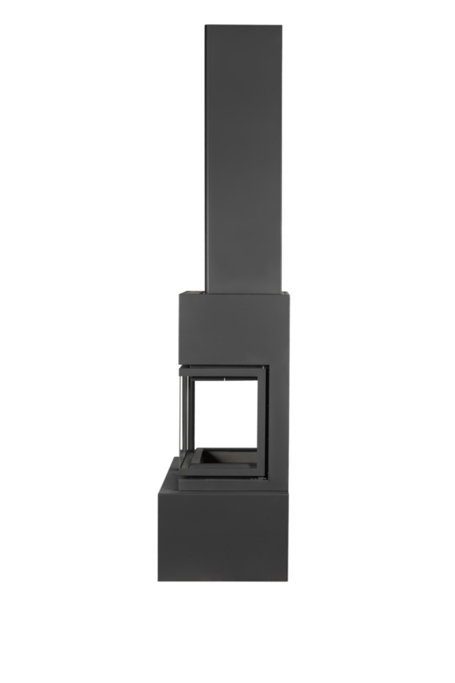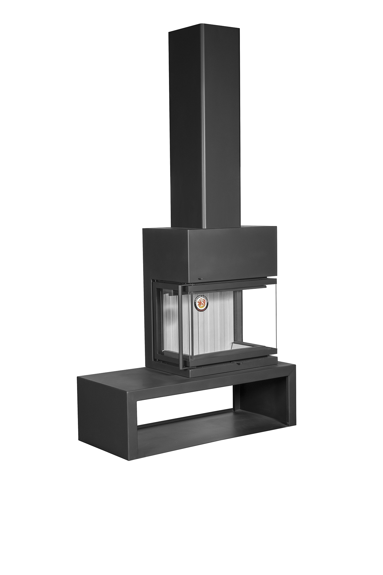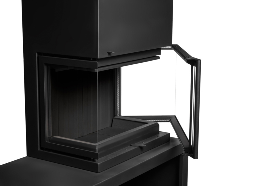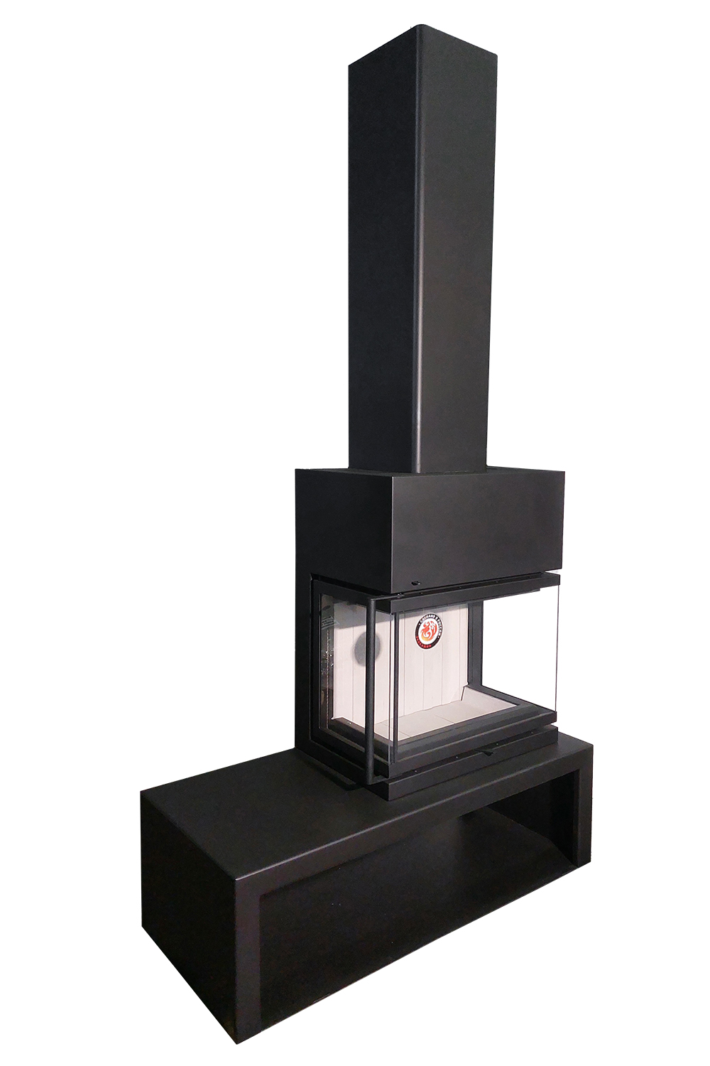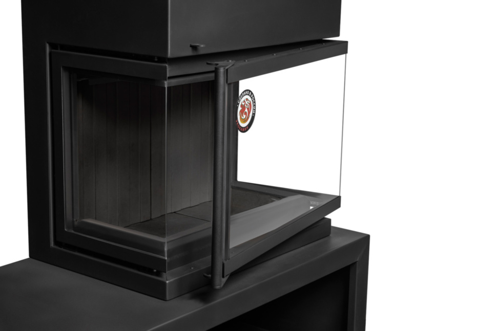 Камин Мадрид серии Гигант справа от Экокамин — это готовое пристенное решение с интегрированным дровником, выполненное в современном стиле. Модель оснащена трёхсторонним панорамным остеклением, обеспечивающим эффектный обзор живого пламени. Конструкция камина включает систему подачи воздуха извне, вторичный дожиг дымовых газов и технологию "чистое стекло", что гарантирует высокую эффективность и удобство эксплуатации.
