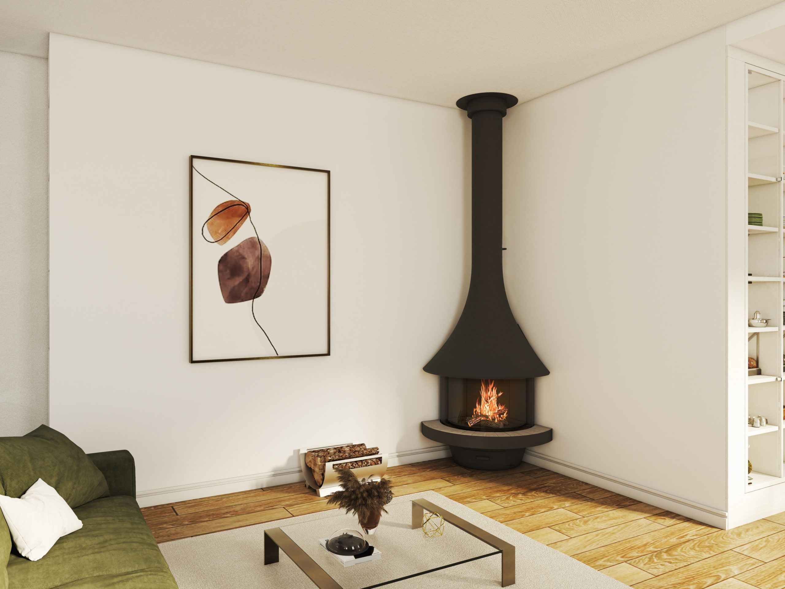 Камин идеально подойдет для современных интерьеров в стиле хай-тек, станет центральным элементом гостиной или зала. Благодаря угловому расположению экономит пространство и создает уютную зону отдыха с живым огнем.