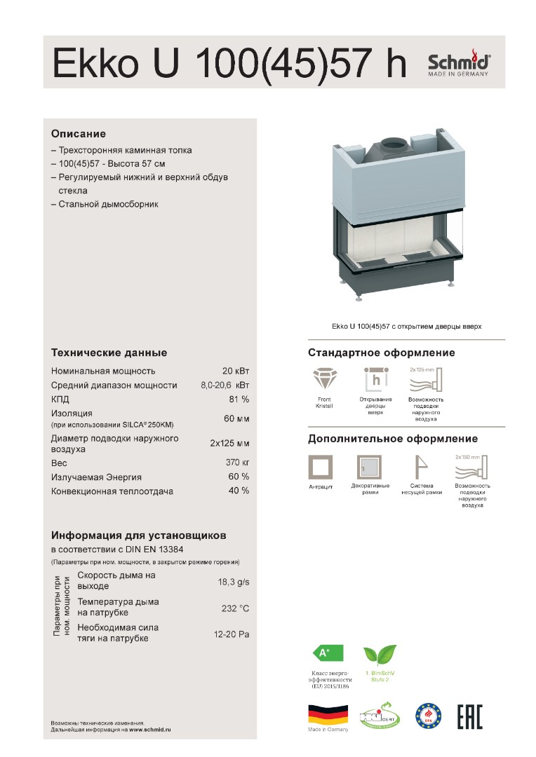 Каминная топка Schmid Ekko U 100(45)51 h представляет собой современное немецкое оборудование для создания уютной атмосферы в вашем доме. Эта закрытая топка с трехсторонним остеклением обеспечивает прекрасный обзор живого огня со всех сторон, создавая неповторимую атмосферу тепла и комфорта.
