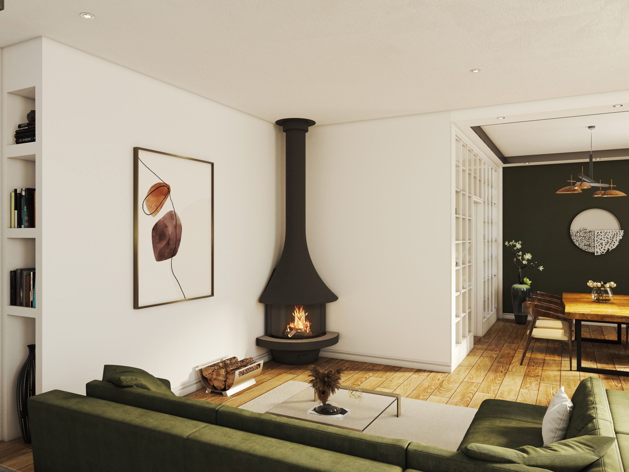 Камин идеально подойдет для современных интерьеров в стиле хай-тек, станет центральным элементом гостиной или зала. Благодаря угловому расположению экономит пространство и создает уютную зону отдыха с живым огнем.